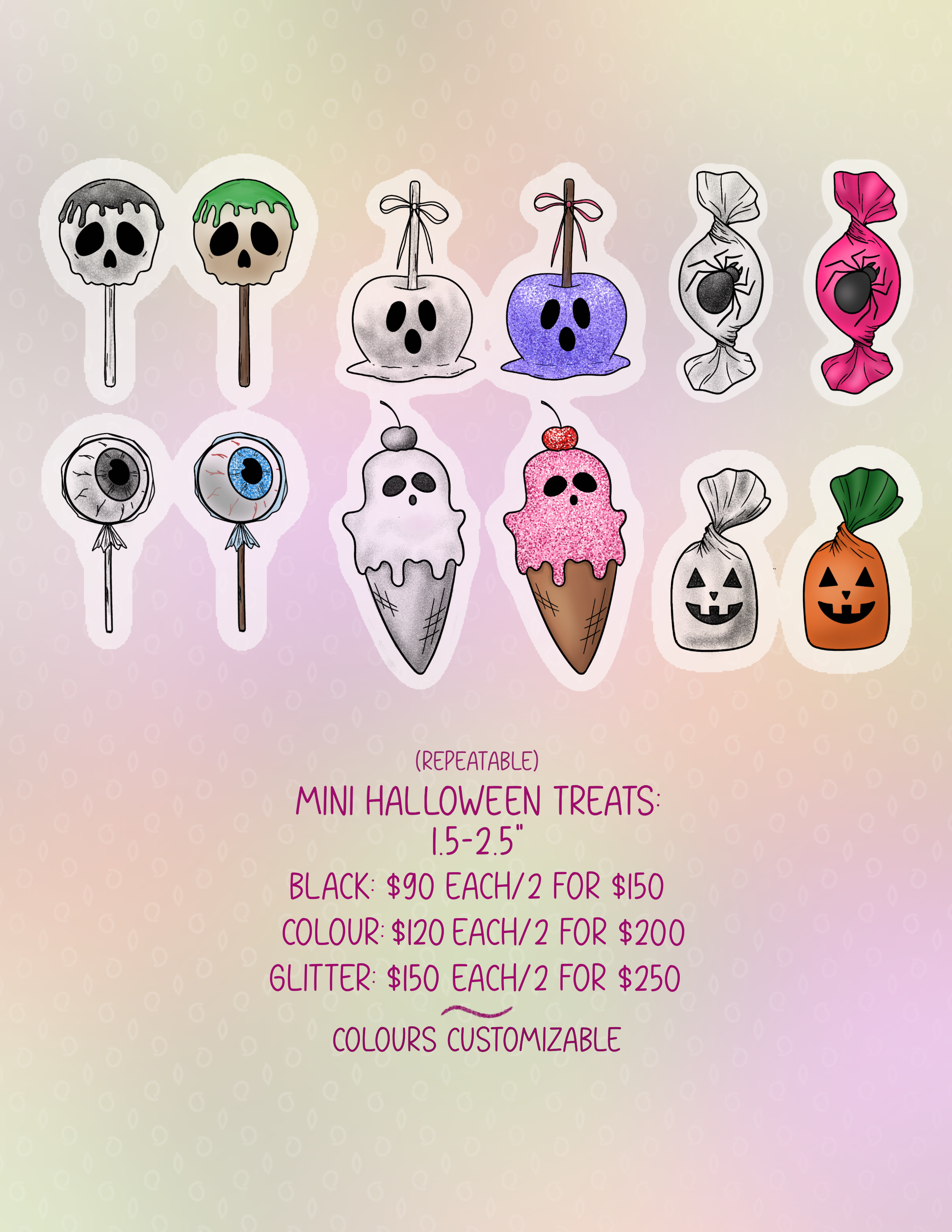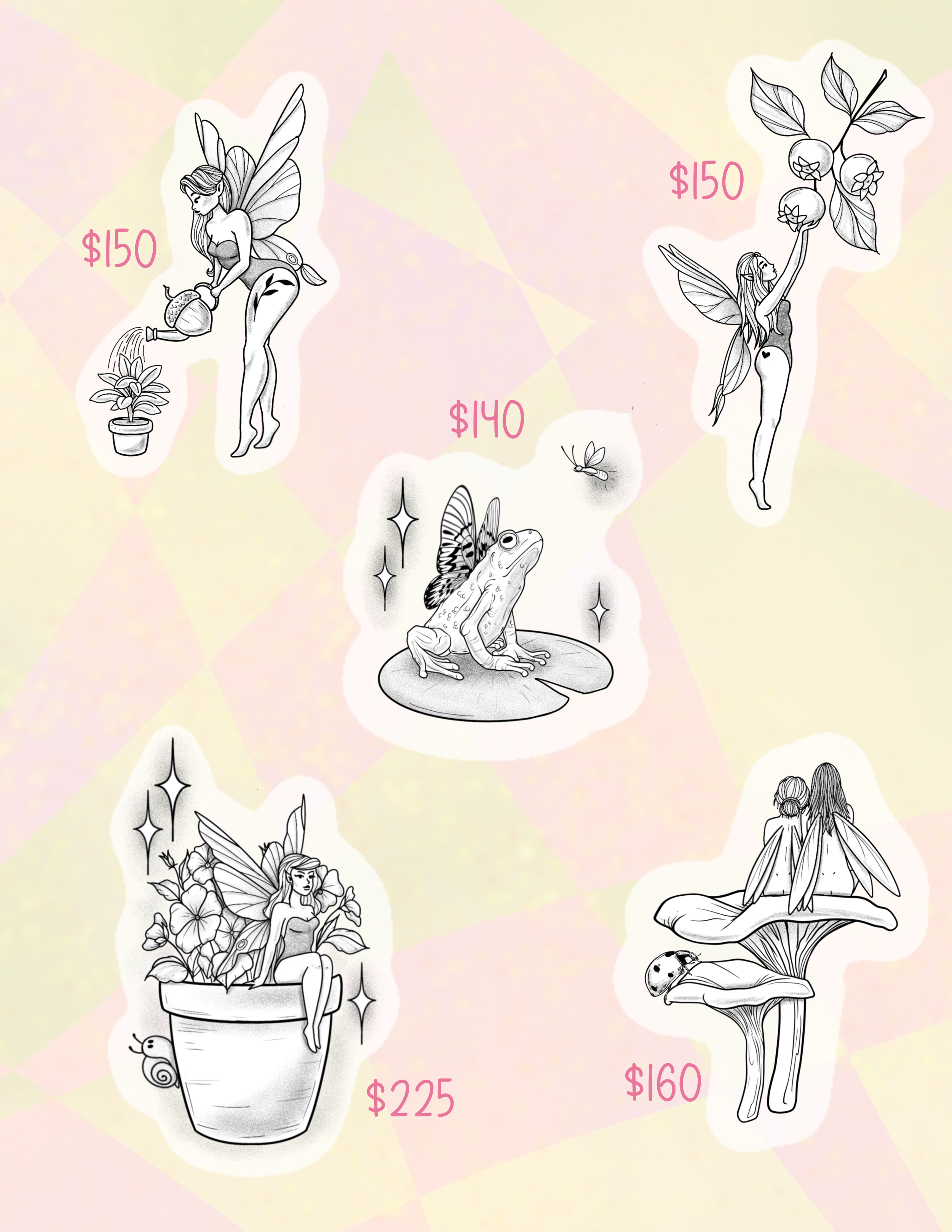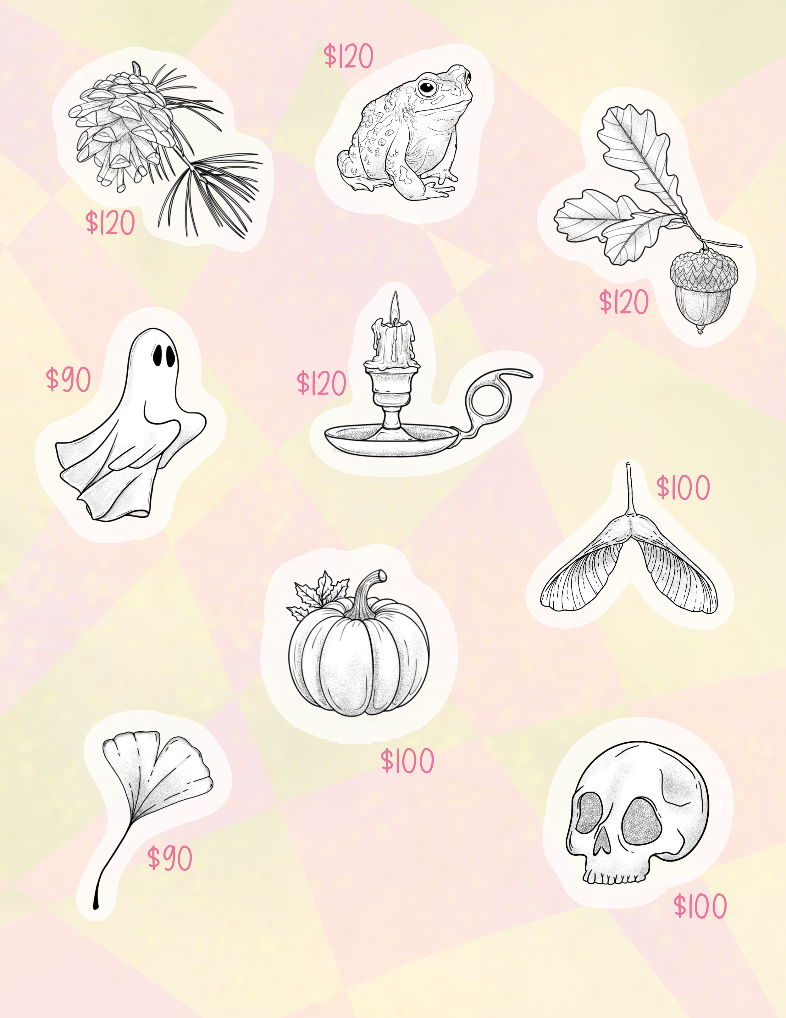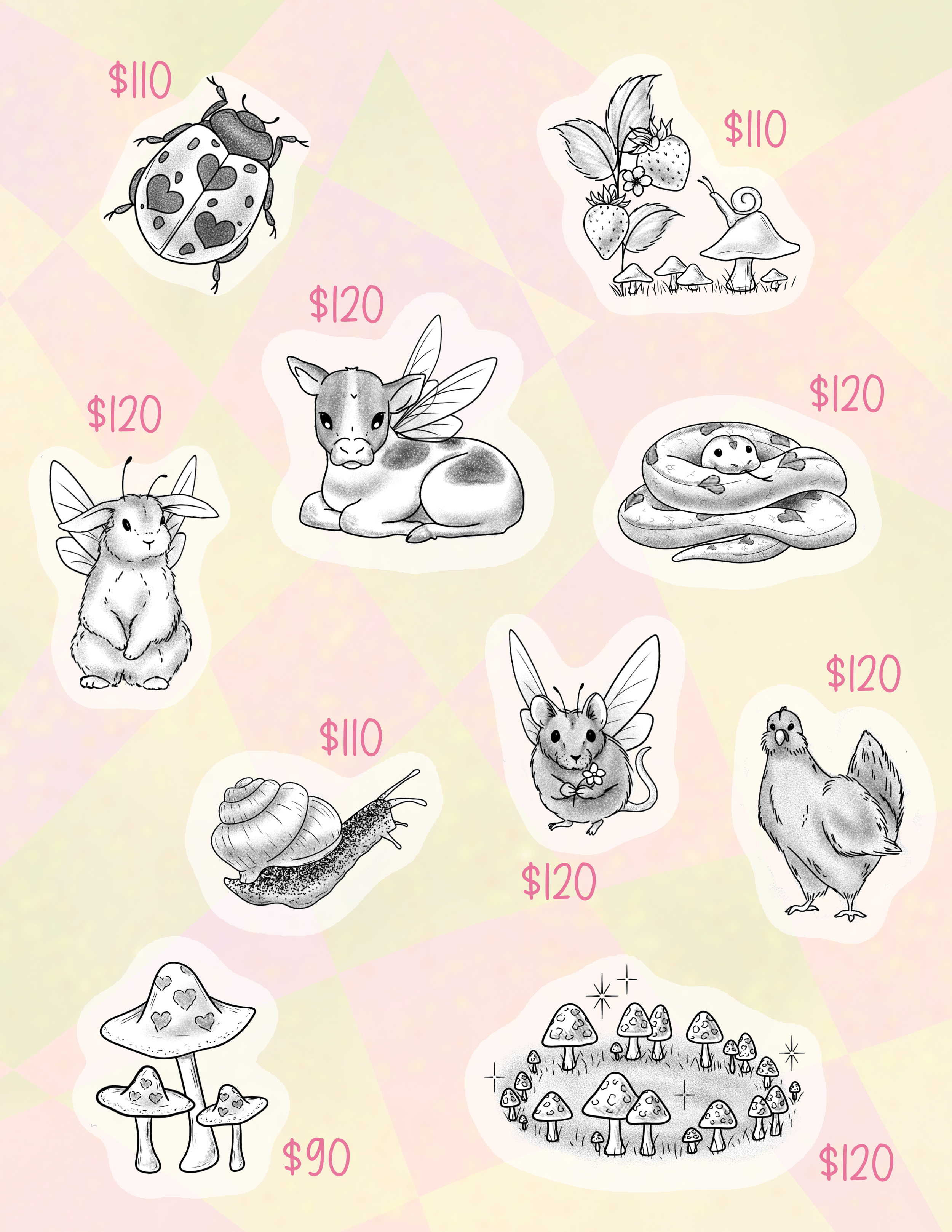 Pricing is based on size & colour. Everything in this section is 3” or under. Please email or Instagram DM me if you need to know the specific size of anything if it is not listed. Colour can be added to any black tattoos for an additional cost. Size can also be changed on select designs at an additional cost.