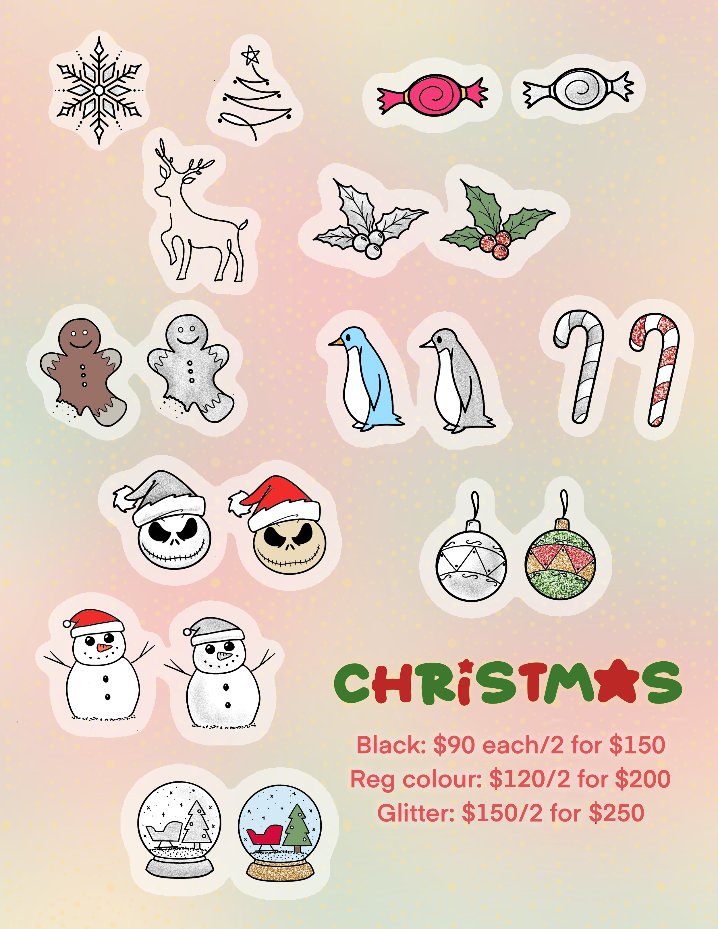 TO BOOK: book directly online HERE, or email or Instagram DM a screenshot of what you want and where you want it. A non-refundable deposit of $20-75 is required.