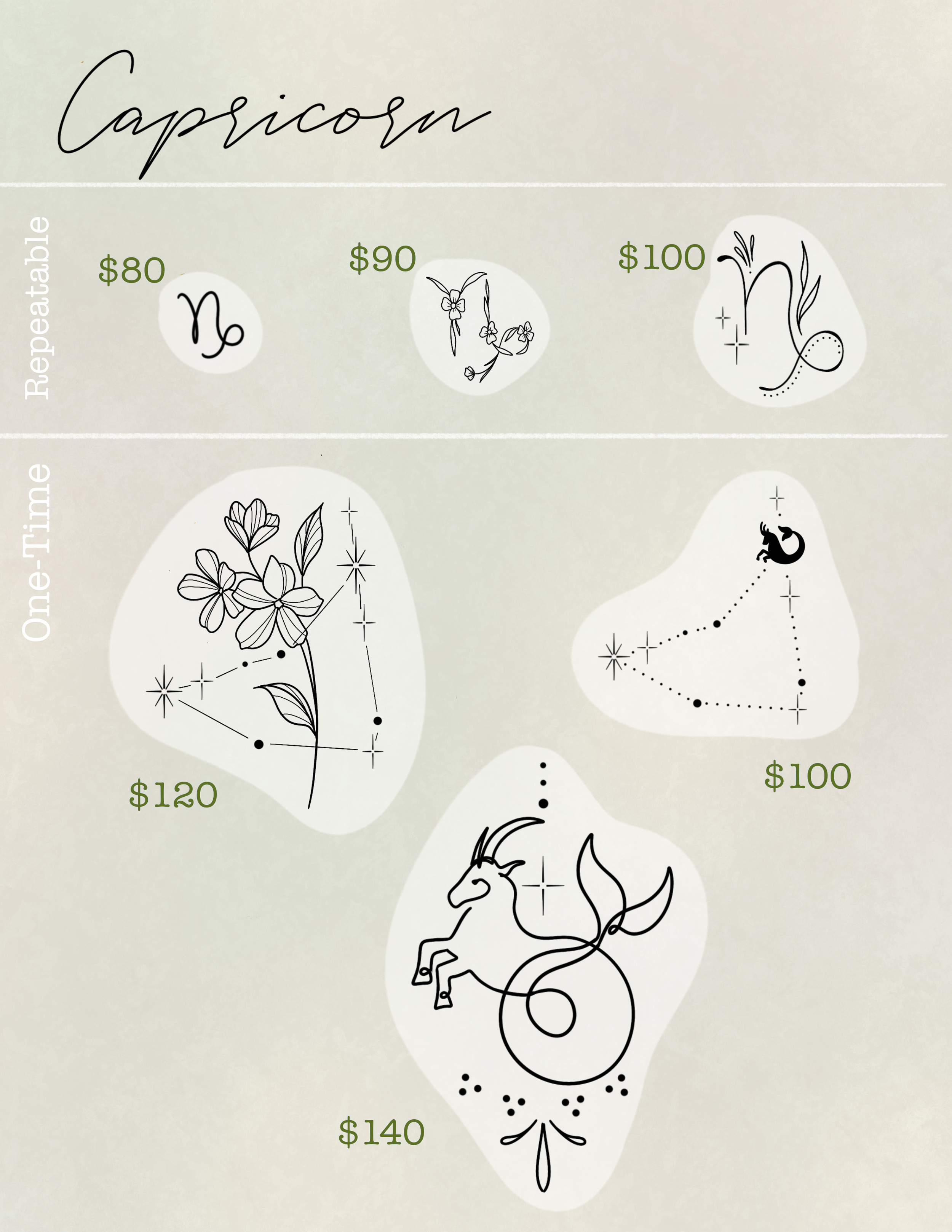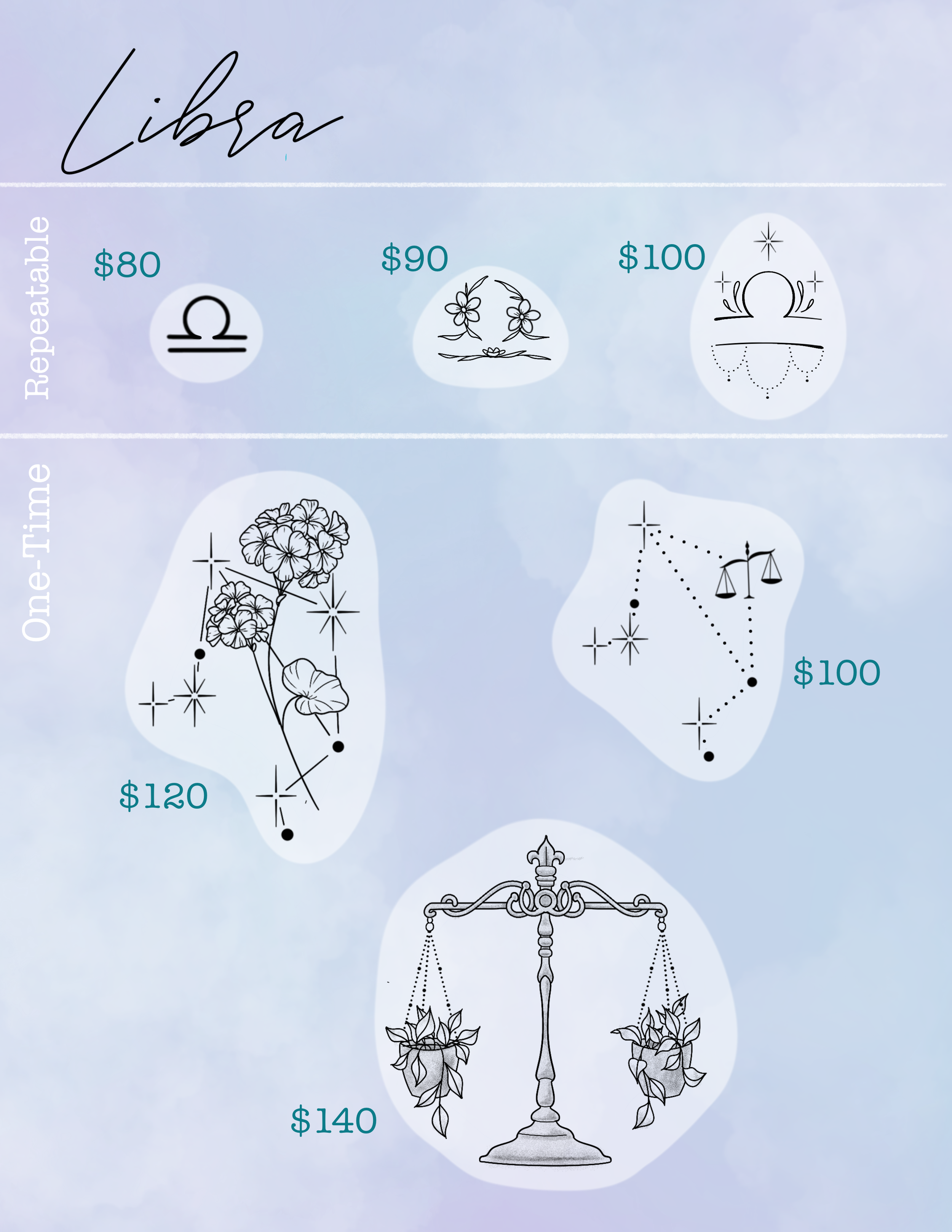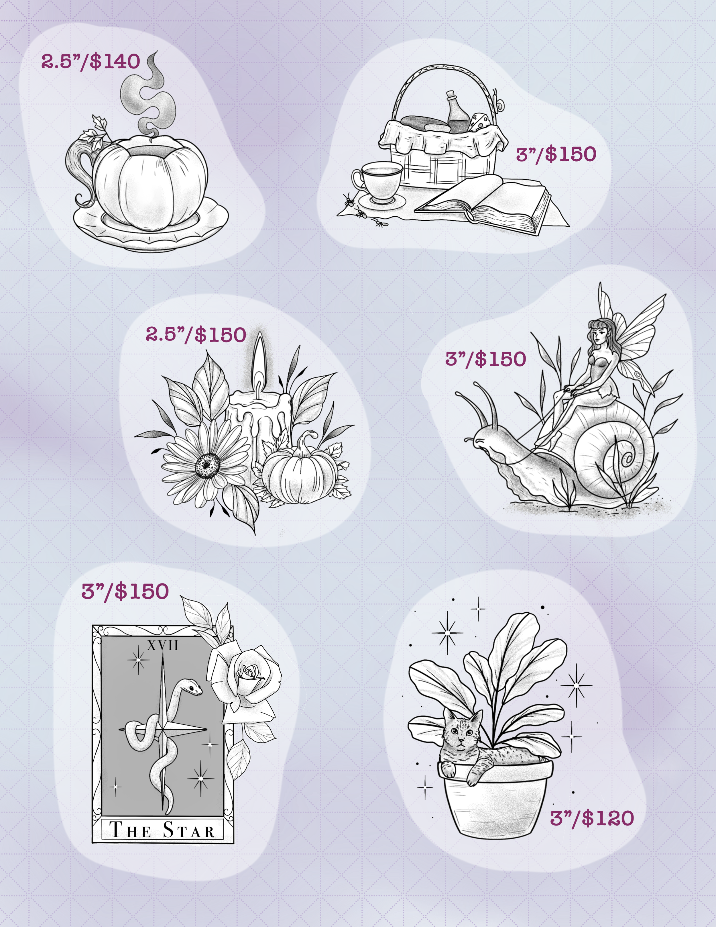 One-time tattoo designs are tattoos that can only be claimed by one singular client, meaning this tattoo will be unique to you only. Please note that the availability of these designs does frequently change. I will let you know if a design is no longer available, or you can check for availability on my Instagram or Facebook.