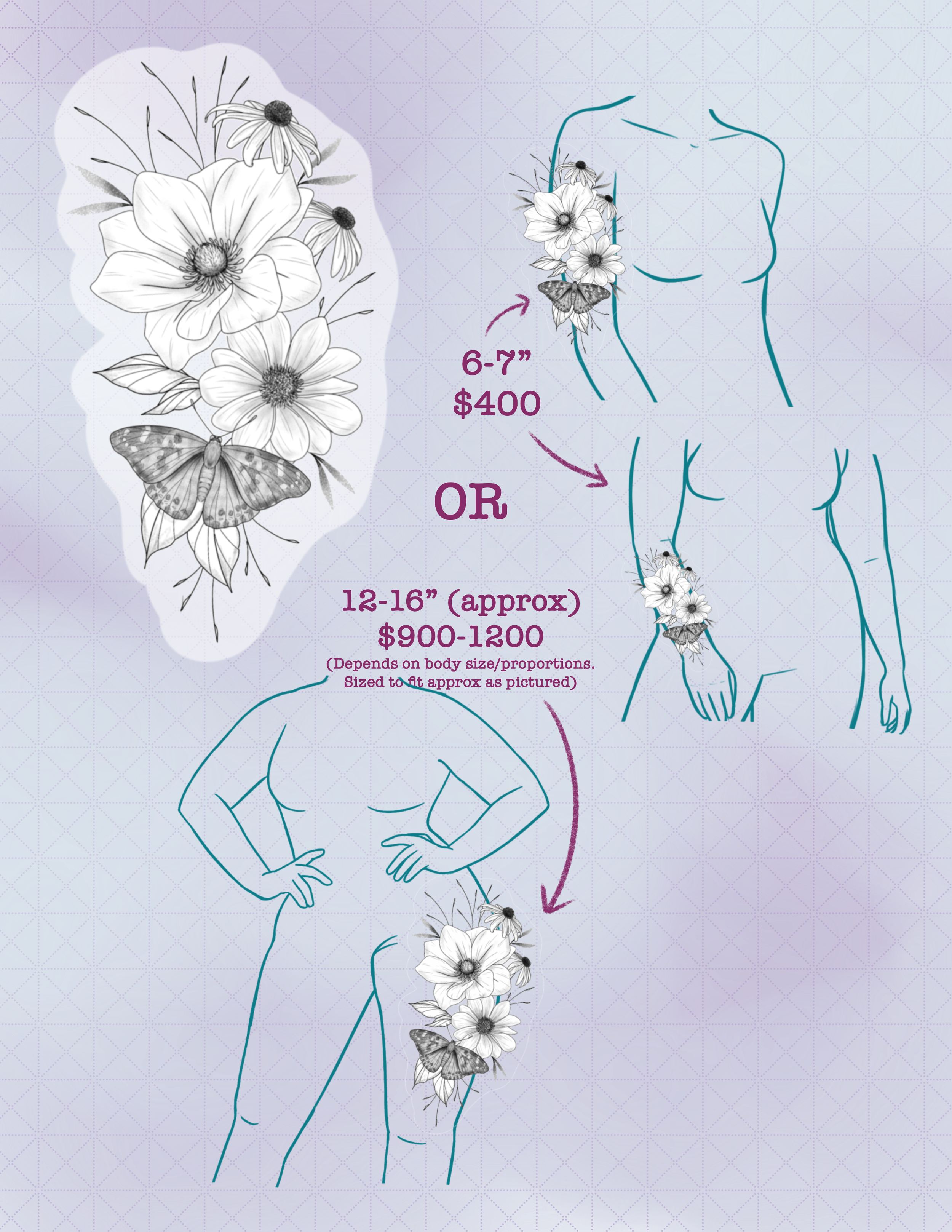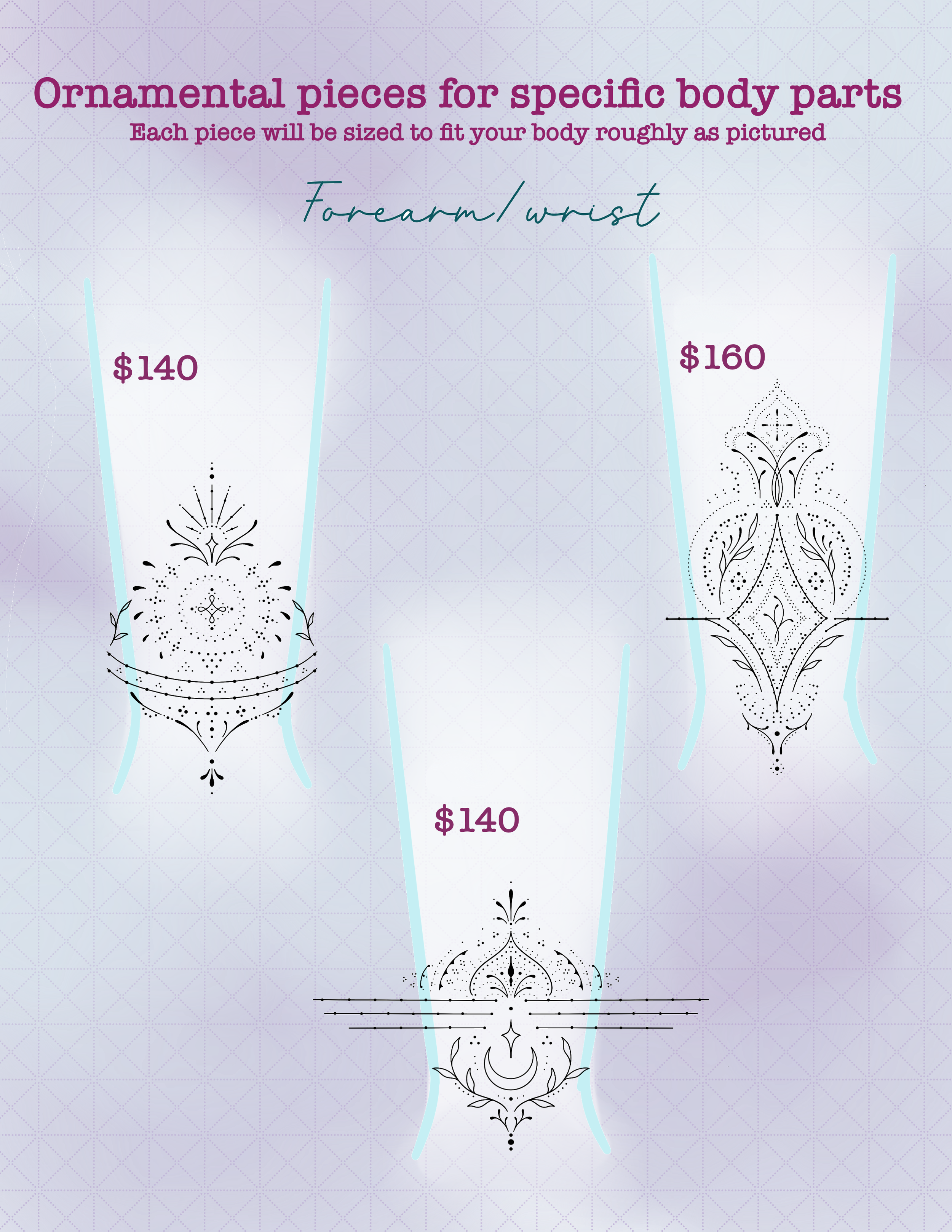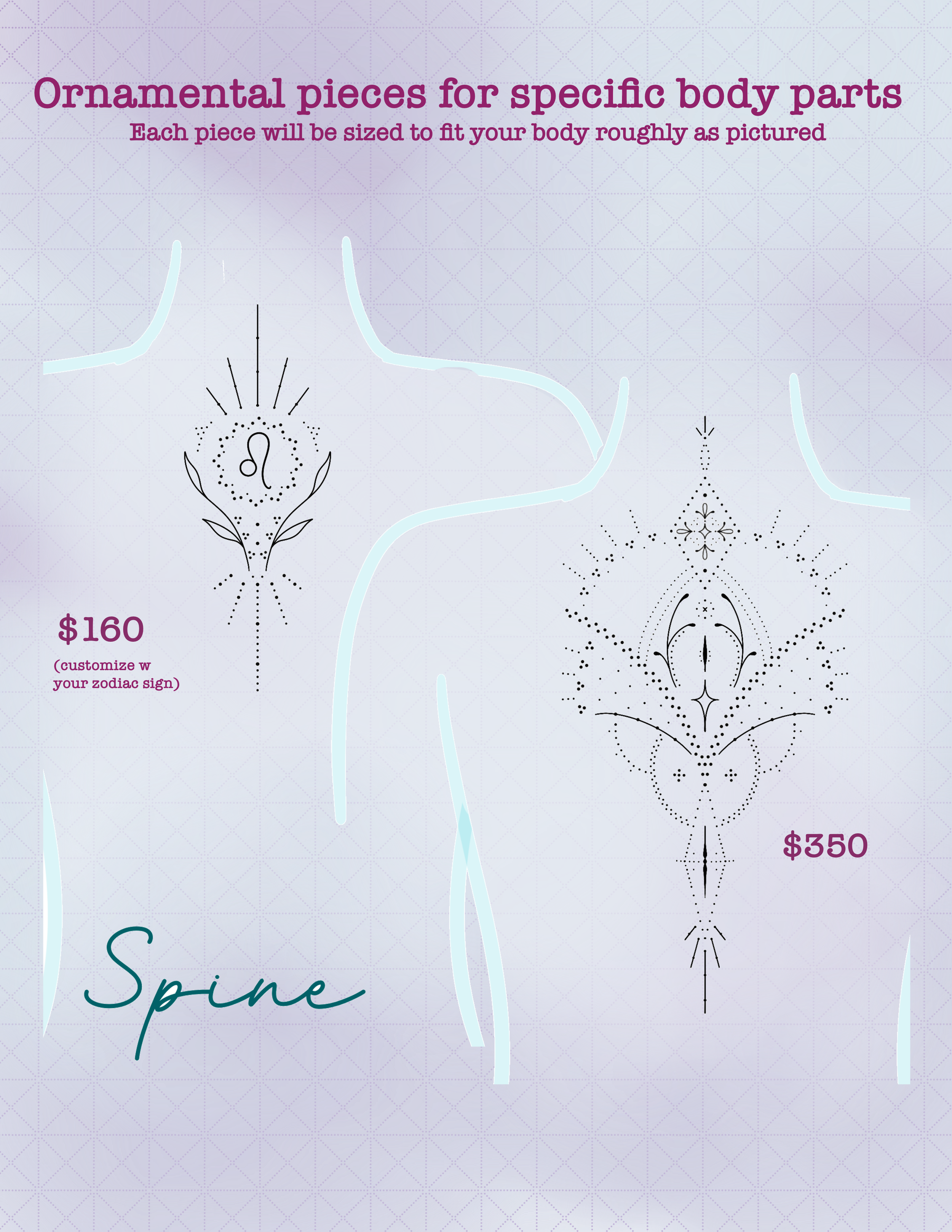 TO BOOK: email or Instagram DM a screenshot of what you want and where you want it. A non-refundable deposit of $50-200 is required.